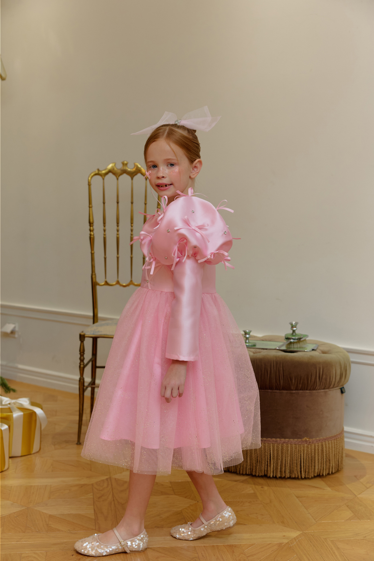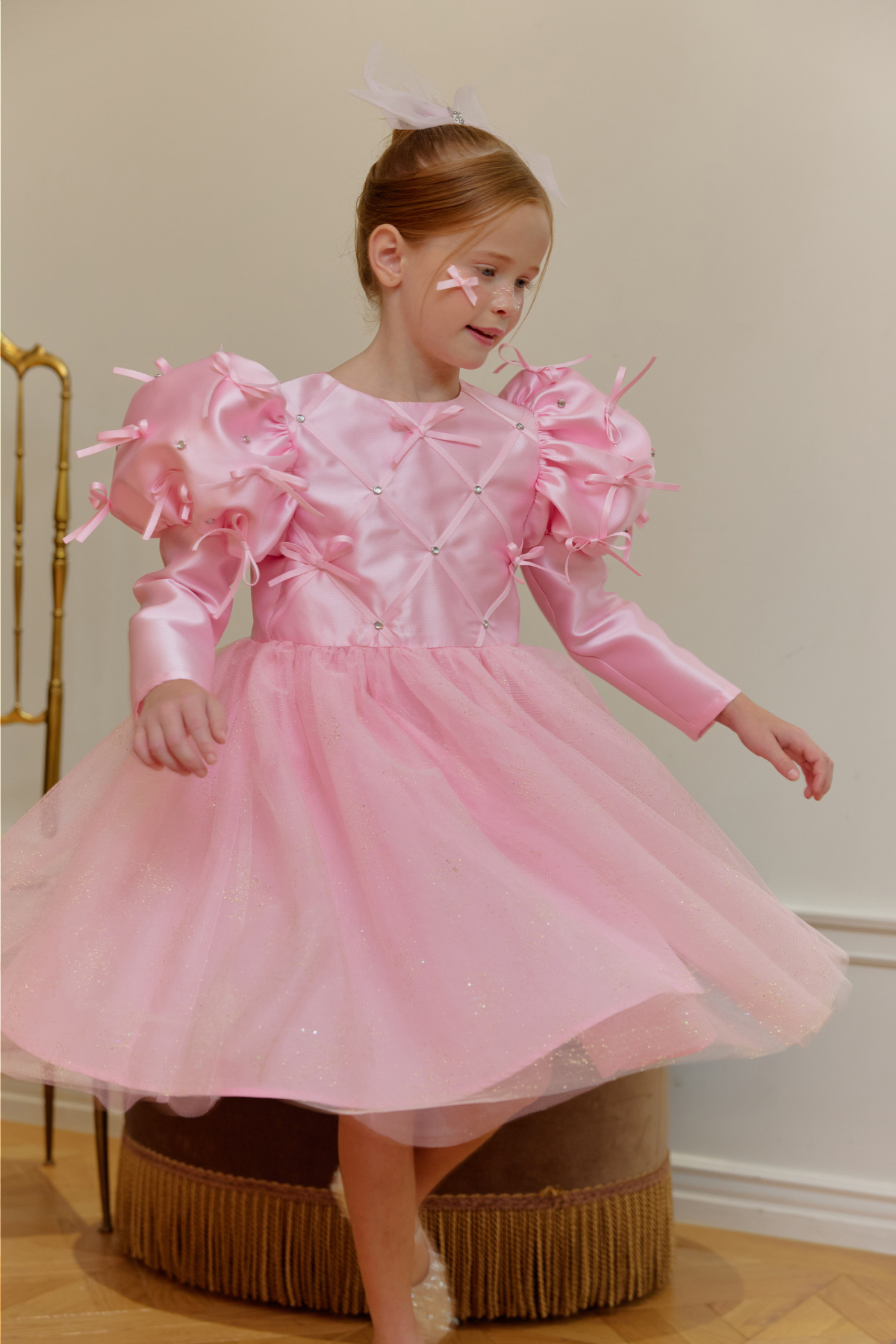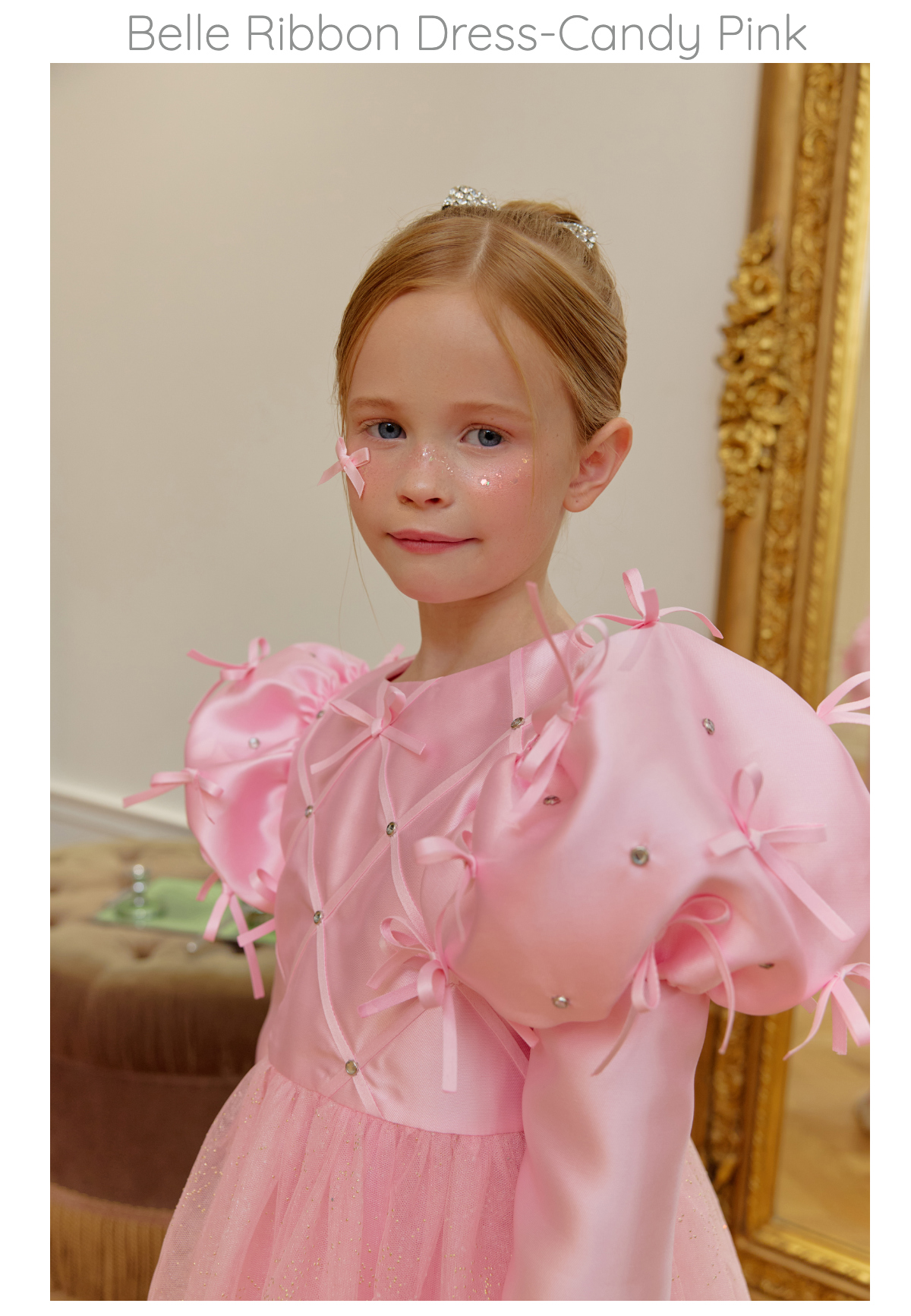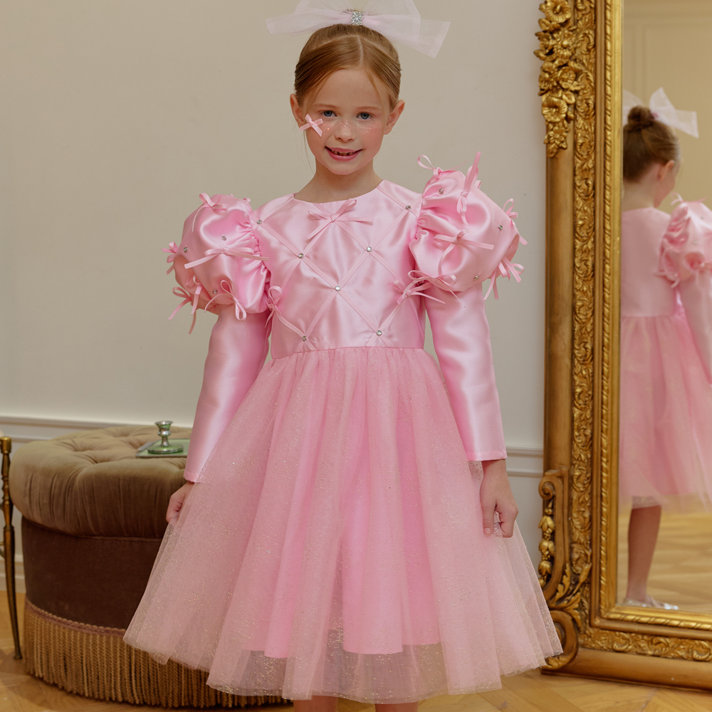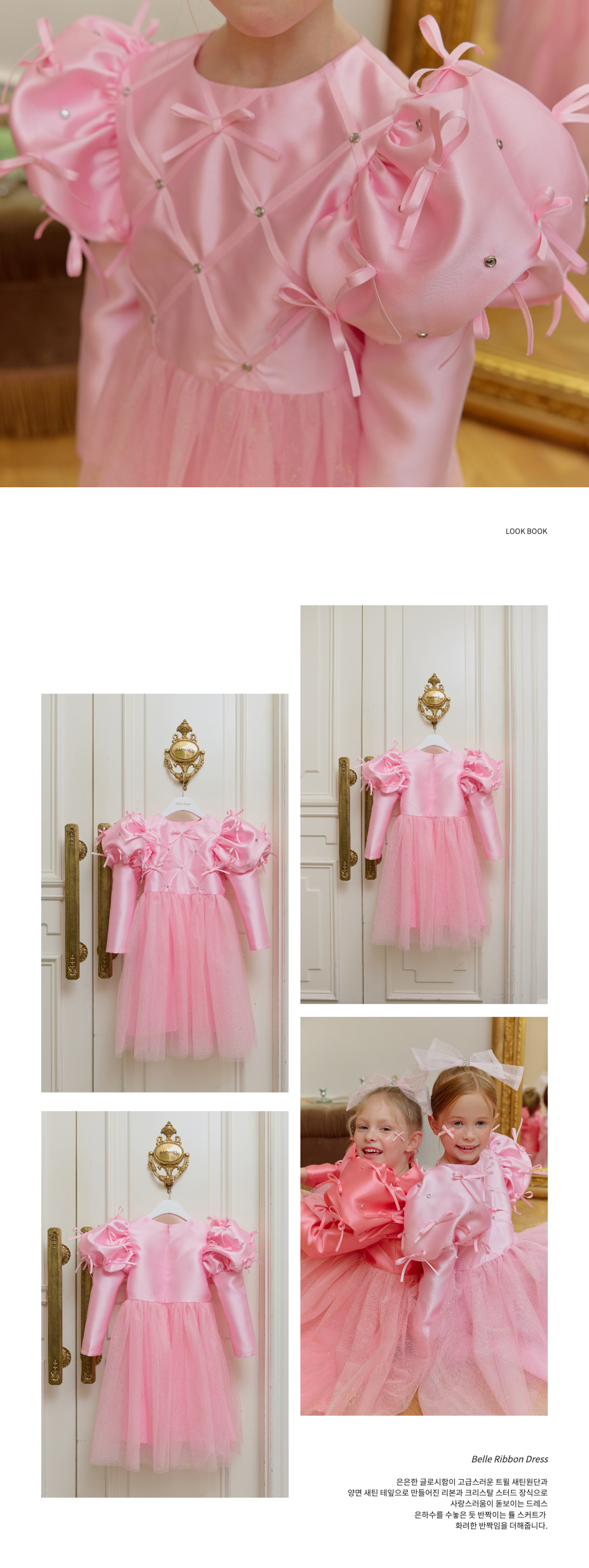 ★캔디 보우 쥬얼 헤어 클립(핑크쥬얼) 세트 특가 오픈★옵션에서 선택해 주세요!--------------------------------------🎀 벨 리본 드레스 (Belle Ribbon Dress)벨 리본 드레스는 작은 아이들이 꿈꾸는 동화 속 주인공의 순간을 선물합니다.볼륨감 있는 리본 장식과 은은하게 반짝이는 튤 스커트가어떤 자리에서도 아이를 가장 빛나게 만들어줘요.코랄 장미빛 같이 화사한 핑크색상으로 더욱 예뻐보이게!키 117cm의 마른 체구 모델은 L(120)을 정사이즈로 착용였습니다.취향에 따라 키 기준 정사이즈, 또는 한 사이즈 크게 선택해 주세요.모델은 캔디 보우 쥬얼 헤어클립-핑크쥬얼 색상과 코디했어요.🌟 제품 특징시그니처 리본 퍼프 디테일어깨의 풍성한 리본 장식이 로맨틱하고 화려한 실루엣을 완성합니다.크리스탈 스터드 & 다이아 패턴의 테잎 장식은은한 광택과 고급스러운 디테일로 럭셔리한 무드를 더합니다.몽글몽글한 글리터 튤 스커트걸을 때마다 반짝이며 사랑스러운 볼륨감을 선사합니다.