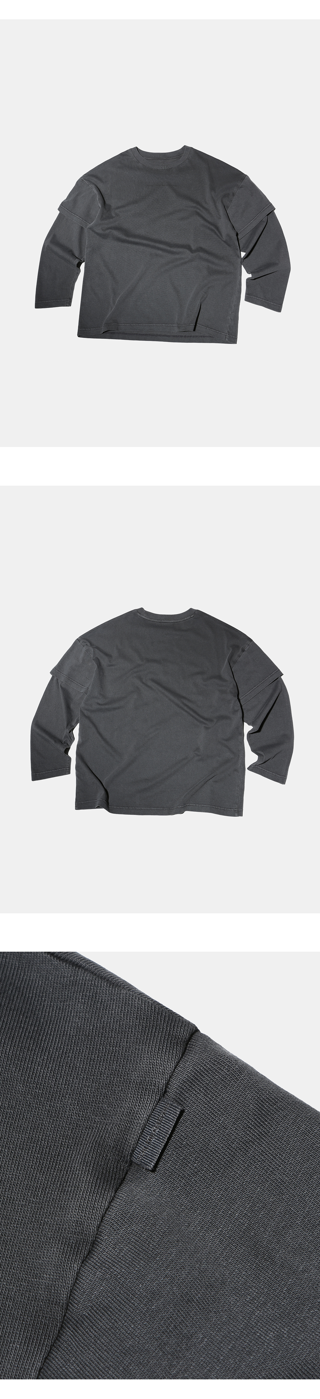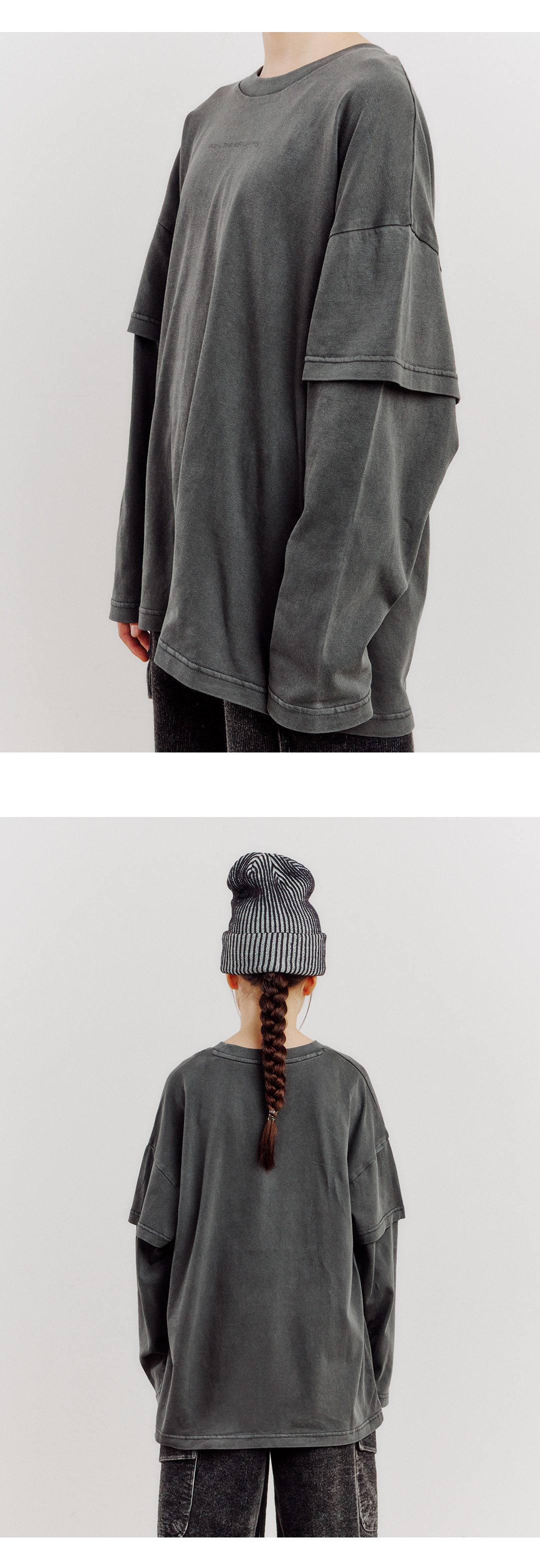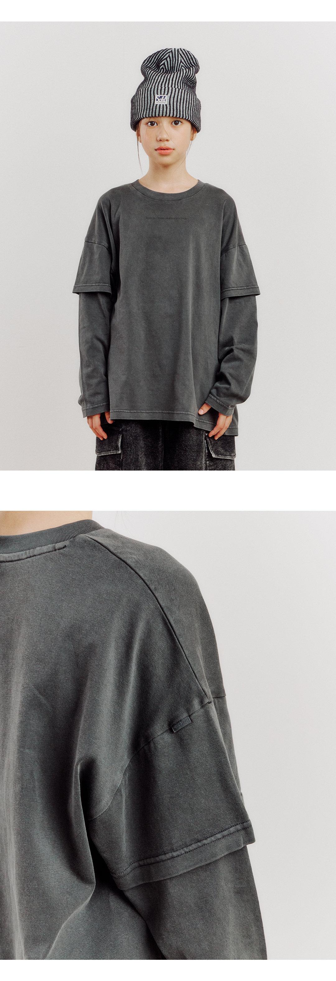 소매에 겹쳐 입은 느낌의 레이어드 디테일과 가슴 부분